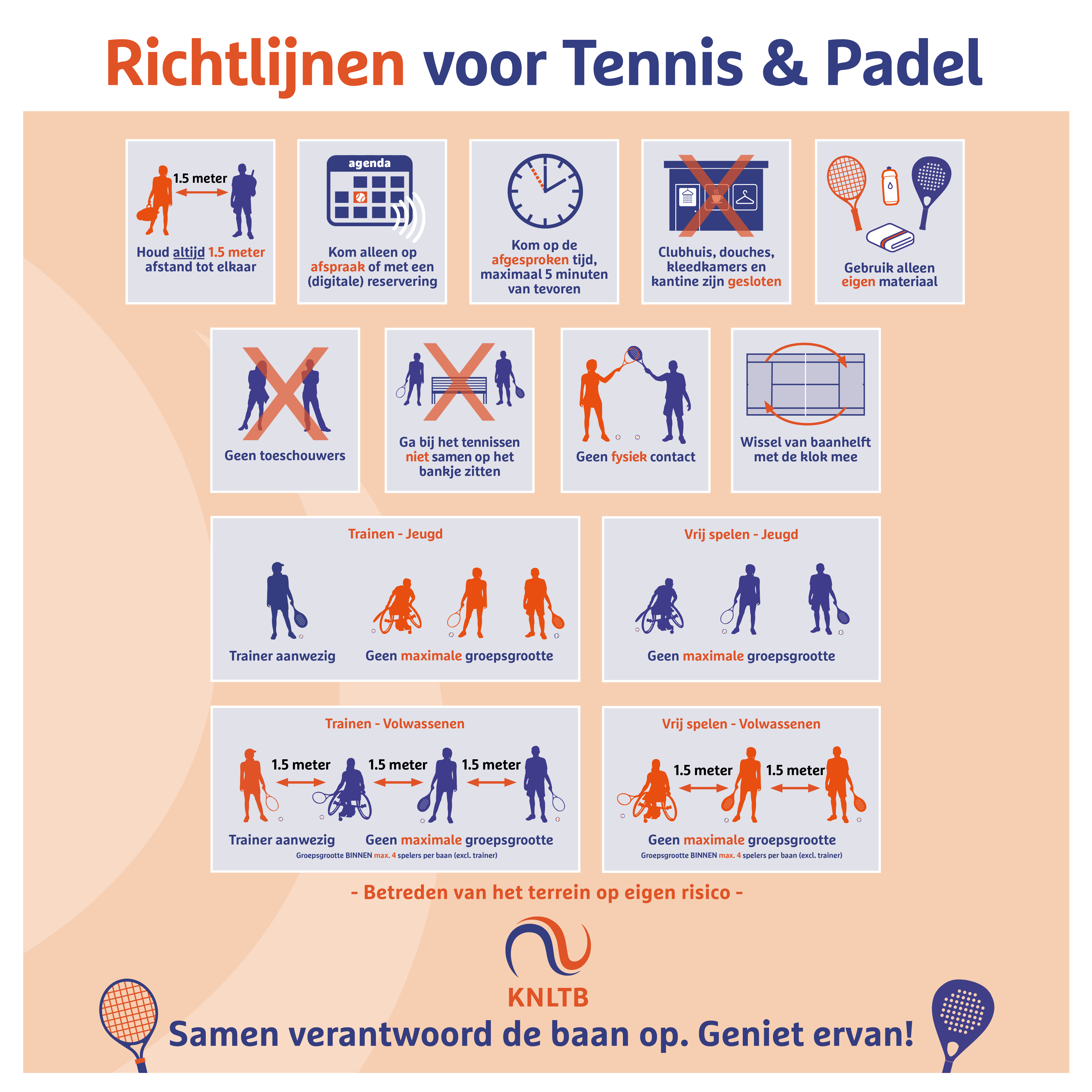 - Tennis en padel binnen is toegestaan, maximaal 30 personen per ruimte (excl. personeel). Volwassenen vanaf 18 jaar mogen dubbelen in vaste koppels van 2 personen; houd altijd 1.5 meter afstand tot het andere koppel en medespeler. Voor jeugd t/m 17 jaar is er geen maximum groepsgrootte, zij hoeven bij het sporten geen 1.5 meter afstand te houden.