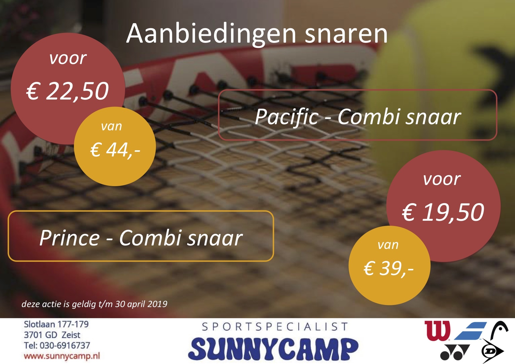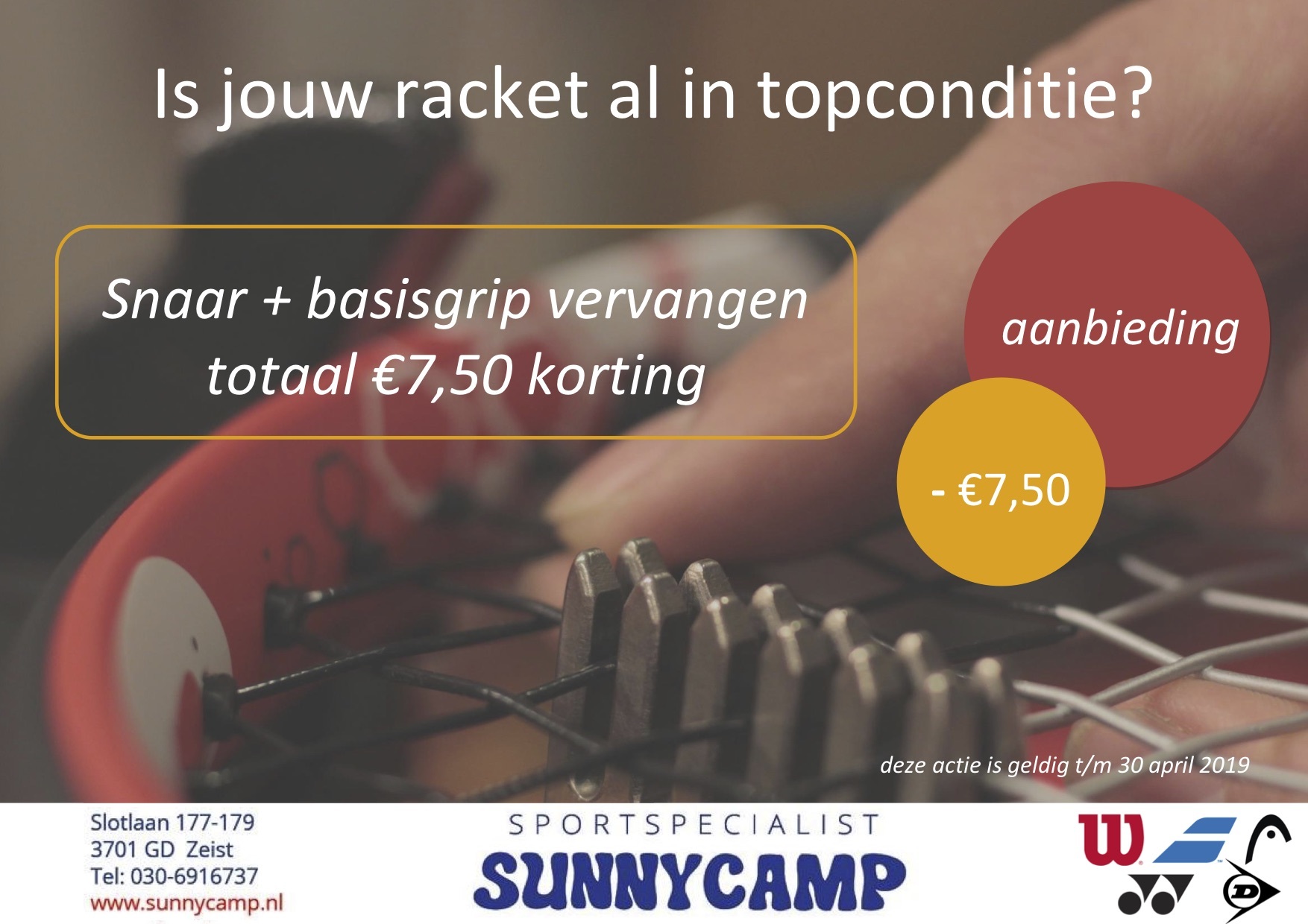 Eén van onze trouwe sponsoren, Sunny Camp, heeft voor SHOT-leden in de maand april een mooie actie om je racket te laten bespannen. Meer informatie vind je hierboven.