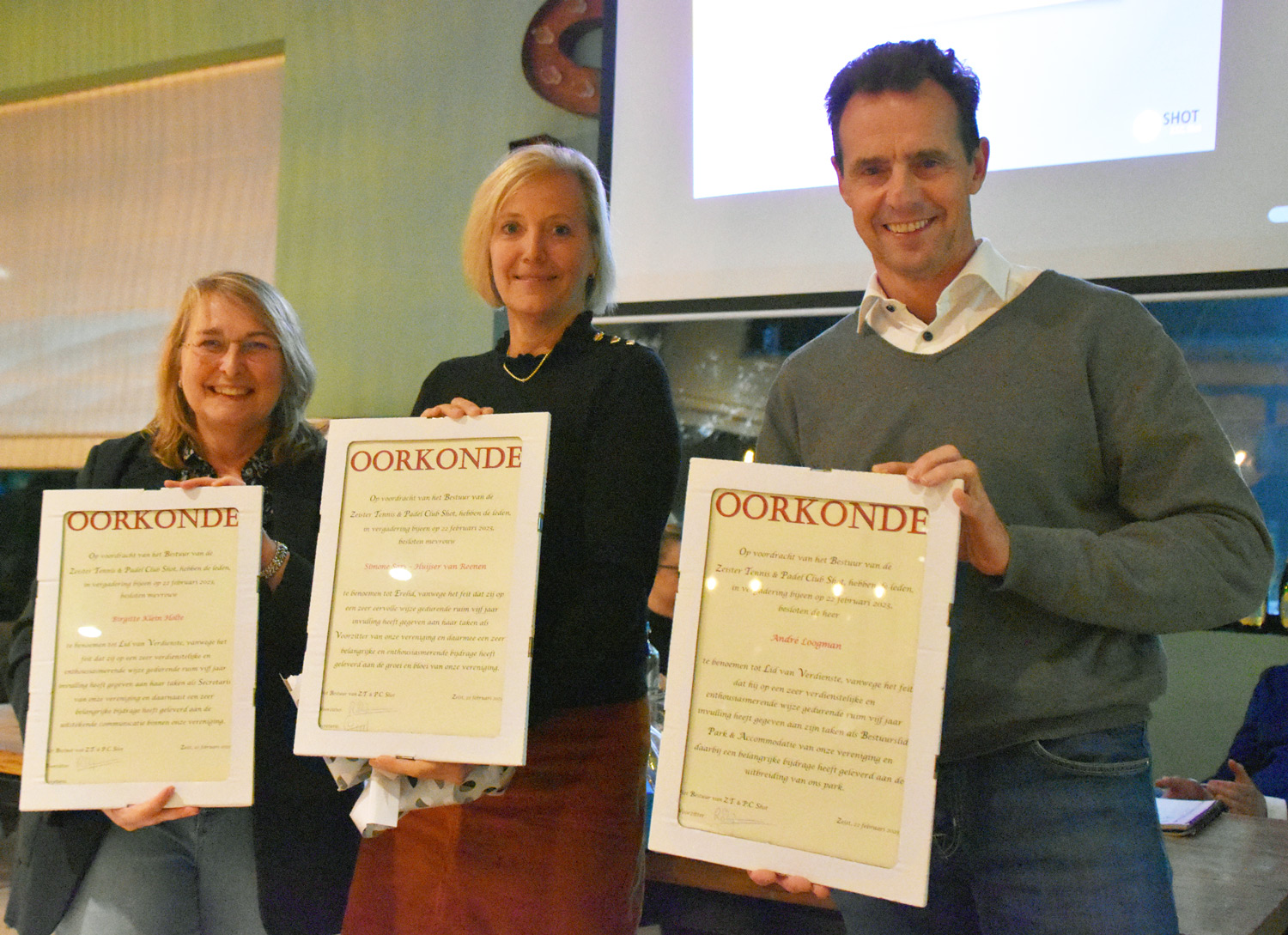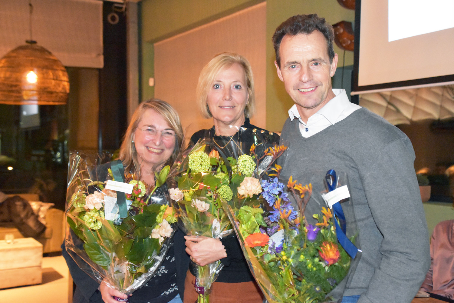 Birgitte (links), Simone (midden) en André (rechts), nogmaals veel dank voor alles wat jullie hebben gedaan en nog steeds doen voor onze vereniging en gefeliciteerd met jullie benoemingen!