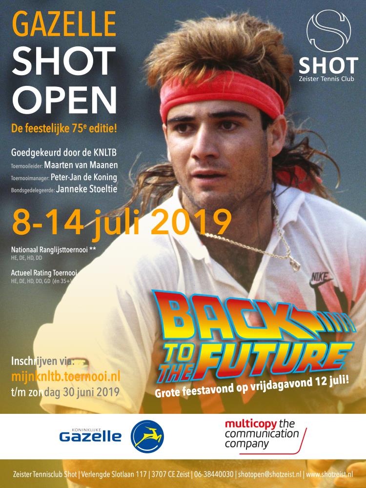 In 2019 wordt voor de 75e keer het Shot Open georganiseerd en dat belooft nu al veel goeds: de nieuwe organisatie gaat er een groot feest van maken voor zowel kampeerders, tennissers, toeschouwers als Shot-leden. Met hulp van nieuwe hoofdsponsor Gazelle zal er een spetterende tennisweek worden neergezet op ons park met op vrijdag 12 juli een geweldige feestavond en op zondag 14 juli toptennis tijdens de finaledag.