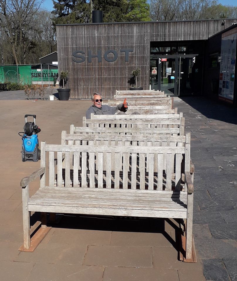 Daarna is Ab begonnen de banken schoon te spuiten met de hogedrukreiniger. Frans de Goede kwam een handje helpen deze week.