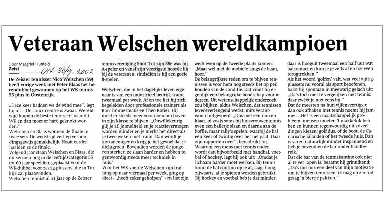 Als tennisveteraan werd Nico samen met Peter Blaas in 2002 Wereldkampioen HD 55+ in Oostenrijk, nadat hij in de jaren er voor ook HD 50+ Europees Kampioen was geworden. Prestaties van formaat! Het onderstaande interview met de kersverse wereldkampioen geeft een mooi inzicht in zijn motivatie en kijk op het tennisspel.