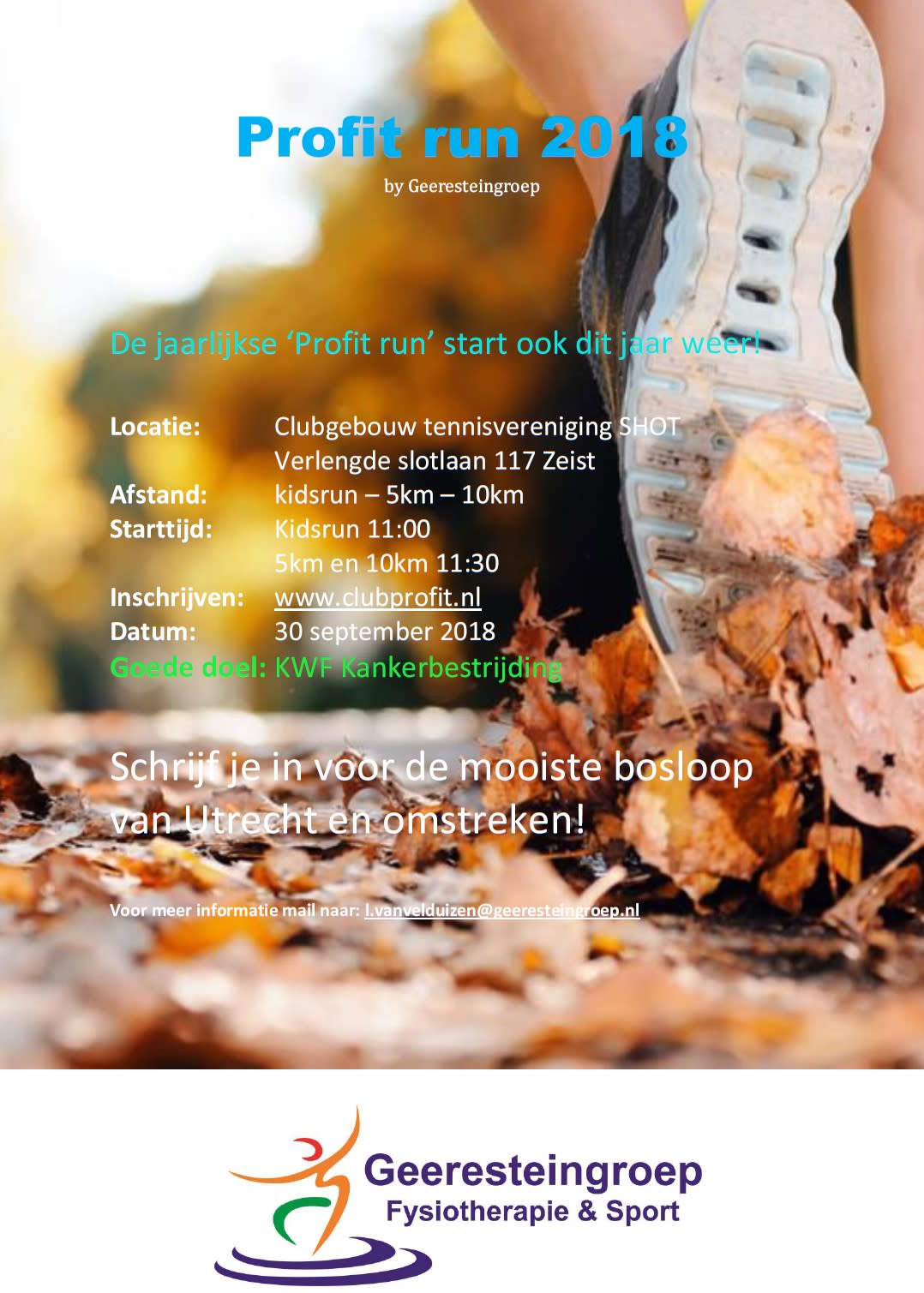 Met als vertrekpunt ons eigen clubhuis belooft de Profit Run 2018 op 30 september 2018 van onze sponsor Geeresteingroep Locatie Profit weer een mooi evenement te worden. Iedereen - en niet in de laatste plaats leden van Shot - is welkom om zich in te schrijven voor de mooiste bosloop van Utrecht en omstreken. Dit kan in de afstanden 5 kilometer, 10 kilometer en voor de leuke Kids Run. Een deel van de opbrengst gaat naar KWF Kankerbestrijding, dus buiten dat je er zelf beter (want fitter) van wordt, help je er ook nog een goed doel mee.