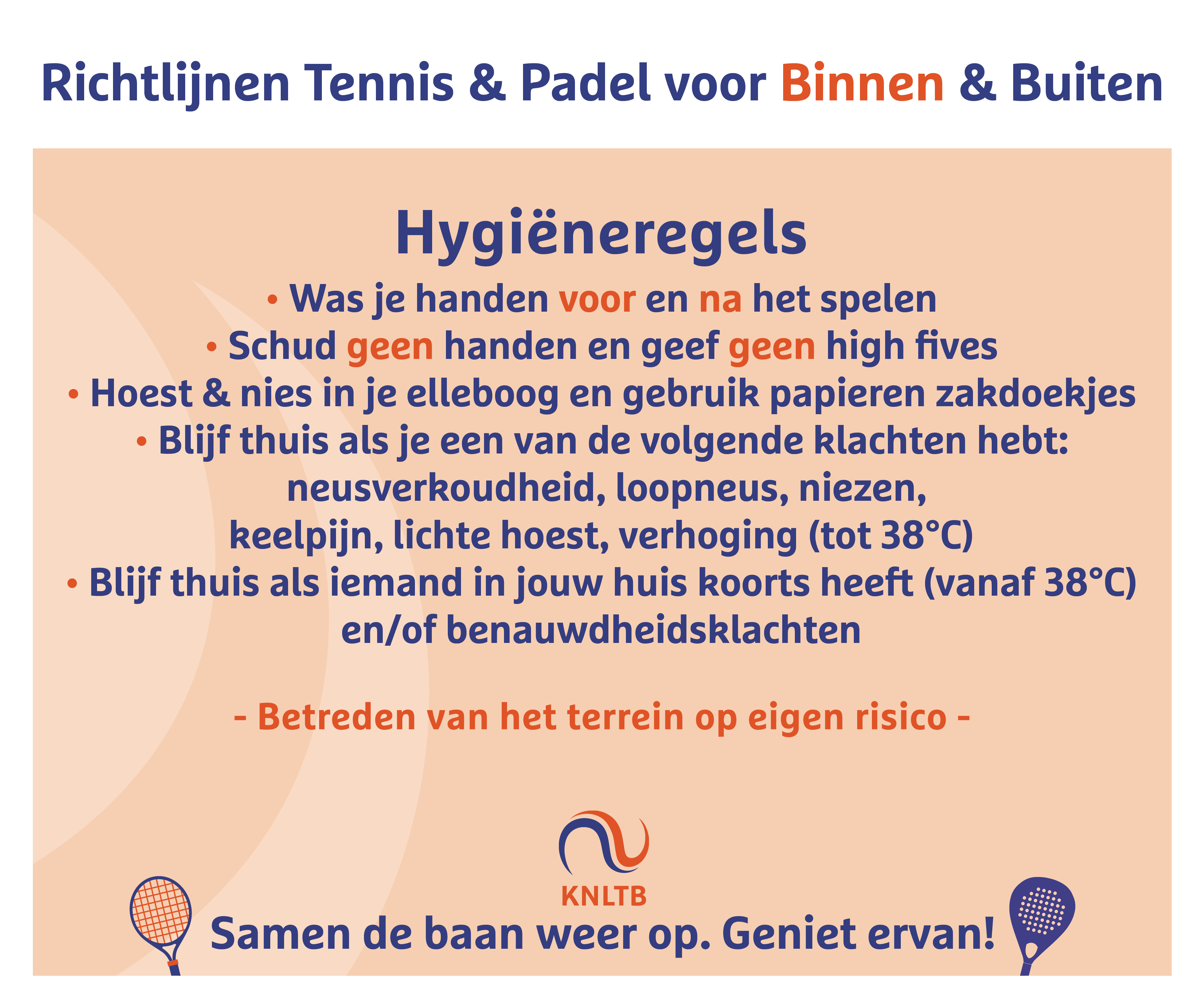 Verder herhalen we nog maar eens dat het Protocol verantwoord sporten en de Aanvullende richtlijnen tennis en padel van 26 juni onverkort van kracht blijven. Dus: 1.5 meter afstand, handen wassen, de looprichtingen op het park en in het clubhuis in acht nemen, bestellingen door slechts 1 persoon en niet blijven staan en al helemaal niet in de deuropeningen. We moeten het nog steeds samen blijven doen als we willen blijven padellen en tennissen! Neem je verantwoordelijkheid en spreek zo nodig ook anderen hier op aan.