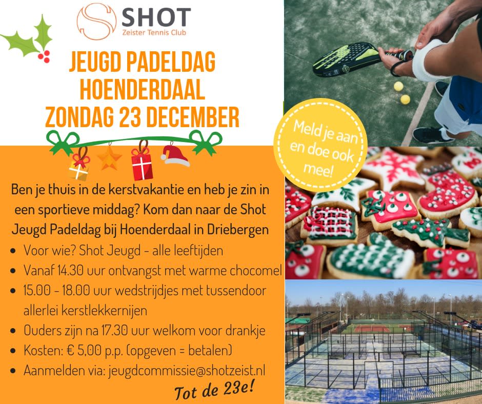 Ben je thuis in de kerstvakantie en heb je zin in een sportieve middag? Kom dan naar Shot Jeugd Padeldag bij Hoenderdaal in Driebergen op zondag 23 december.