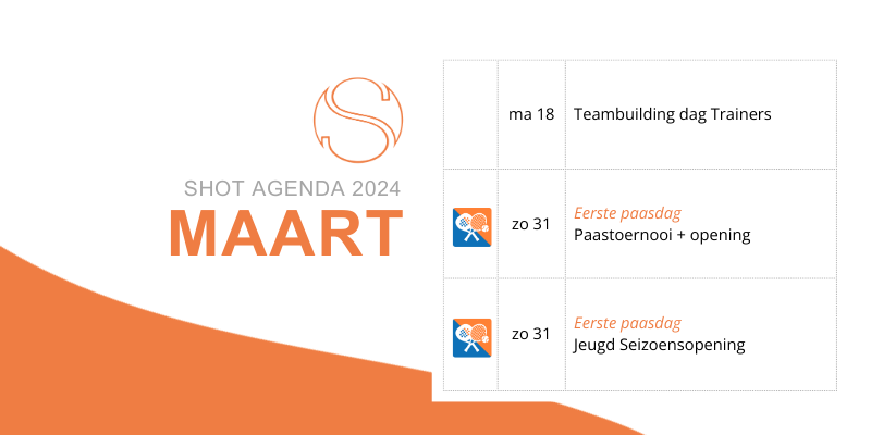 Hierbij de Shot kalender voor de maand maart. Heel belangrijk, want seizoensopening en Paastoernooi.