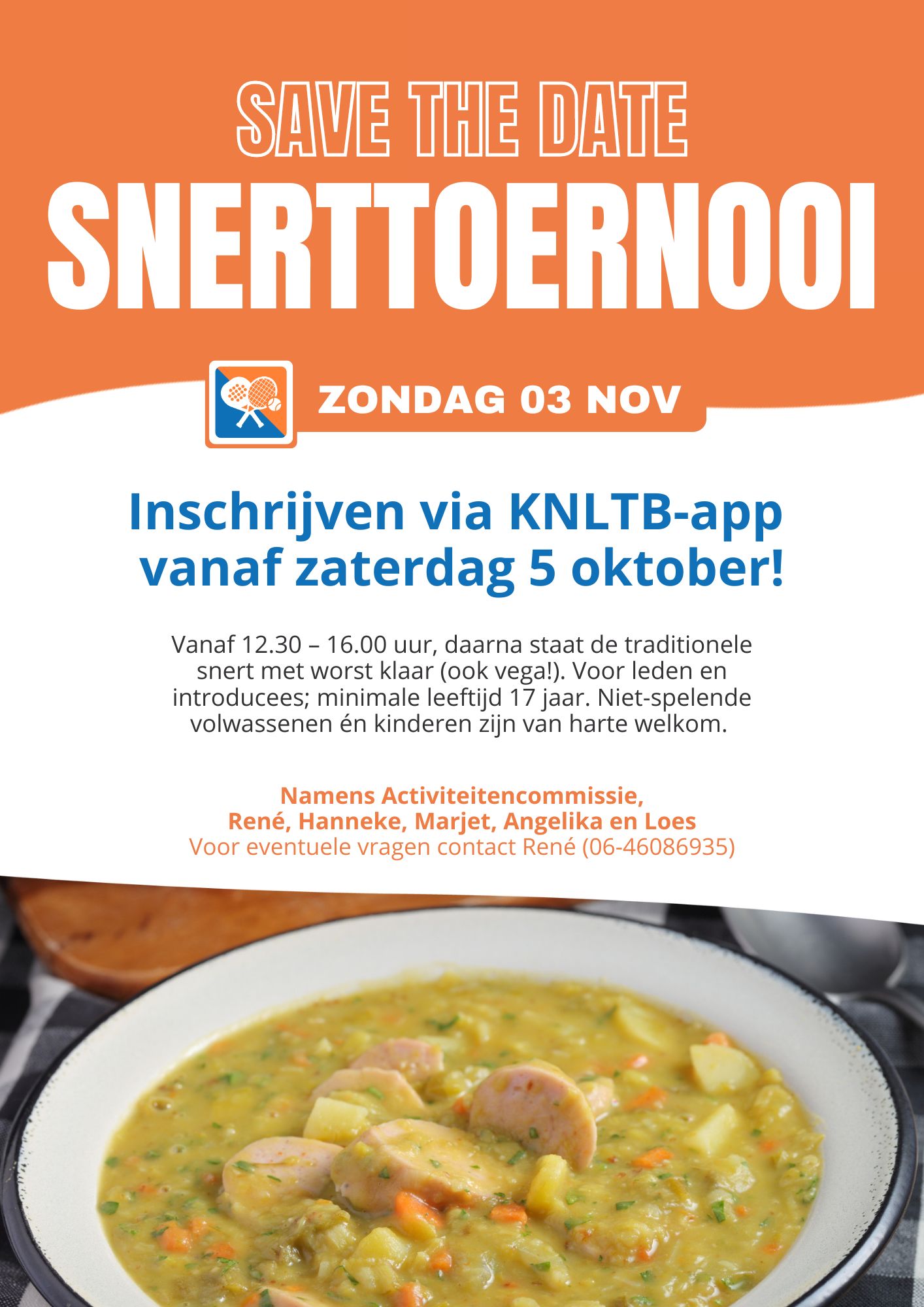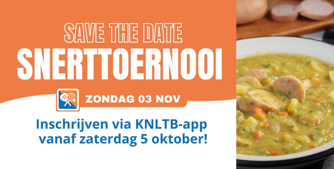 Het snerttoernooi (Padel & tennis) vindt plaats op zondag 3 november. Op deze zondag zullen we zorgen voor leuke padel en tenniswedstrijden, je kunt je voor één van beiden inschrijven: tennis of padel. We starten om 12.30 uur met het toernooi, met vanaf 16 uur de traditionele snert (met worst, maar er is ook een vega-variant).