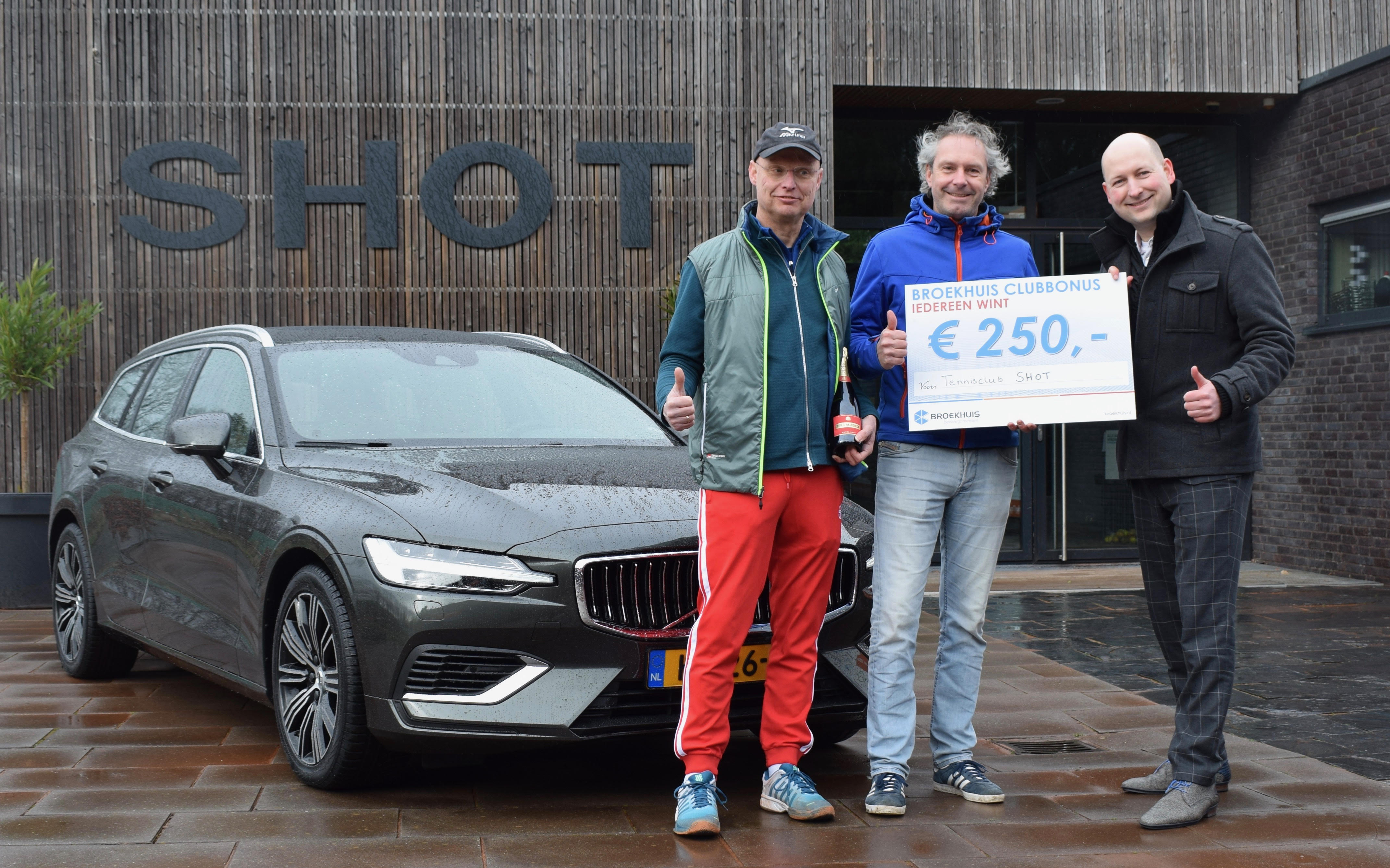 Een bijzonder leuke bijkomstigheid is dat Broekhuis sponsor is van onze vereniging en voor iedere aankoop van een auto, nieuw of gebruikt, Volvo of Ford, een Clubbonus van 250,- in de clubkas stort! Op de foto overhandigt Mark Klop van Broekhuis officieel de Clubbonus aan Karel Lisman van de sponsorcommissie van Shot.