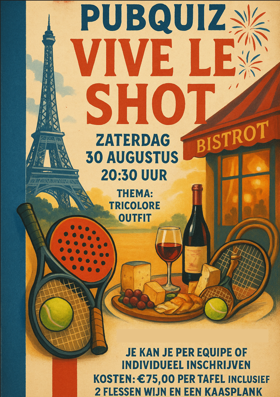 Bonjour mes amis! Op zaterdag 30 augustus om 20:30 verandert onze vereniging in een Franse bistro vol sfeer, kennis en joie de vivre. Het is tijd voor de Vive le Shot Pubquiz – een avond vol gezelligheid, wijn, kaas en quizvragen met een Frans tintje.