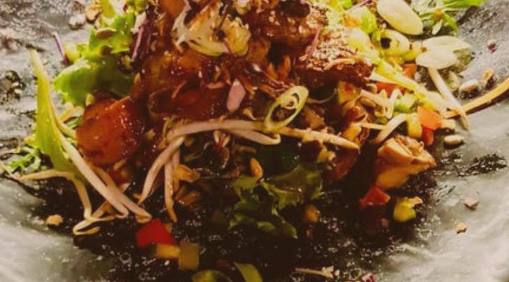 Heerlijk gegrilde pittige kippendijen saté van de GREEN EGG met Oosterse gewokte groenten, atjar, kroepoek, pindasaus en frieten!