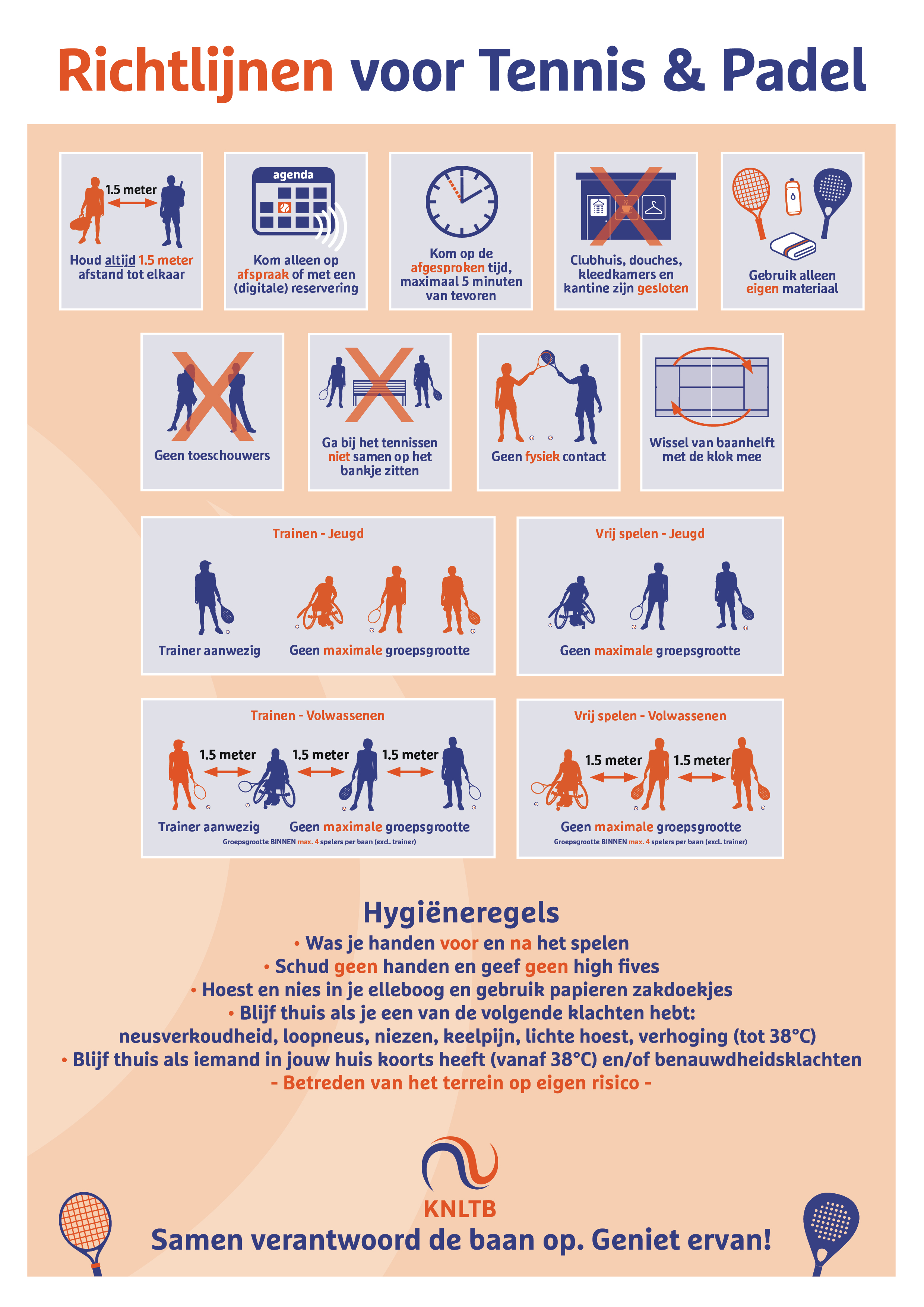 - Tennis en padel binnen is toegestaan, maximaal 30 personen per ruimte (excl. personeel). Volwassenen vanaf 18 jaar mogen dubbelen in vaste koppels van 2 personen; houd altijd 1.5 meter afstand tot het andere koppel en medespeler. Voor jeugd t/m 17 jaar is er geen maximum groepsgrootte, zij hoeven bij het sporten geen 1.5 meter afstand te houden.